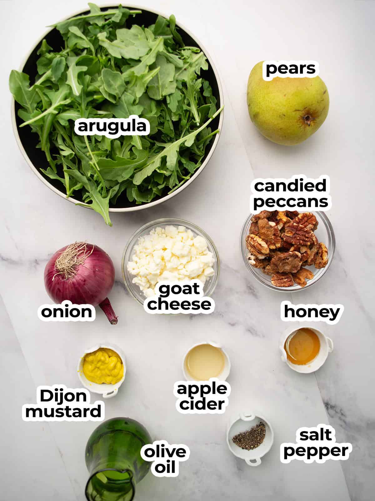Arugula pear salad with goat cheese, candied pecans, and Dijon vinaigrette. A fresh, 10-minute fall favorite for holidays or weeknight sides.