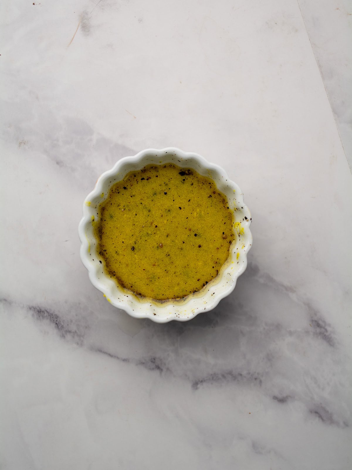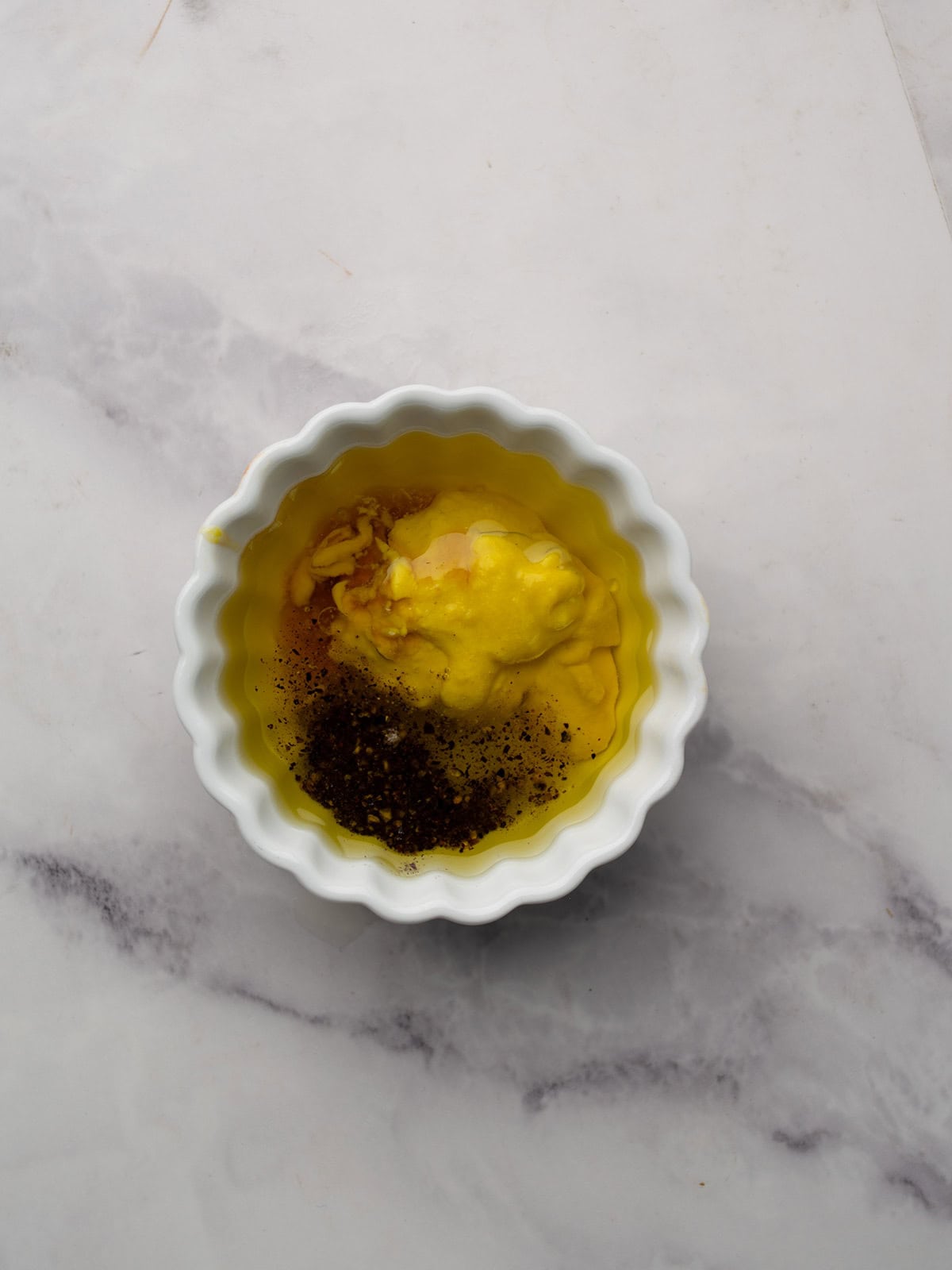1. In a small jar or bowl, add olive oil, apple cider vinegar, Dijon, honey, salt, and pepper.