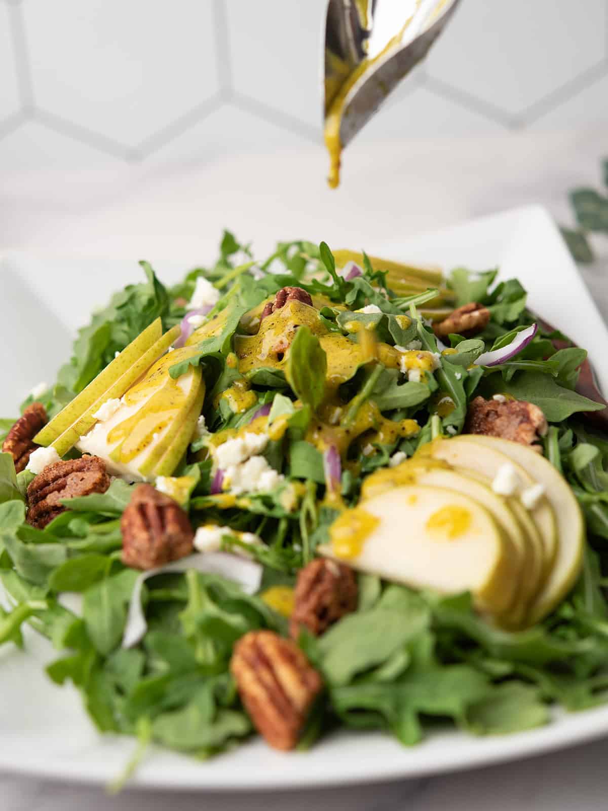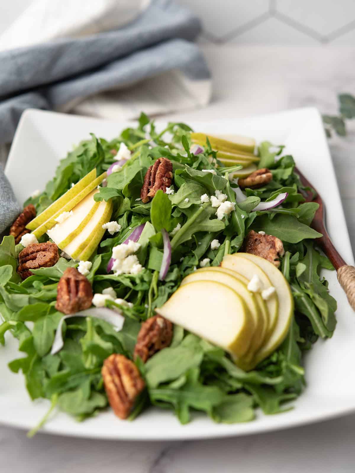 This Arugula Pear Salad is simple, crisp, and fresh, made with candied pecans, goat cheese, and topped with a honey Dijon vinaigrette. A classic salad with greens, it has always been an all-time favorite.