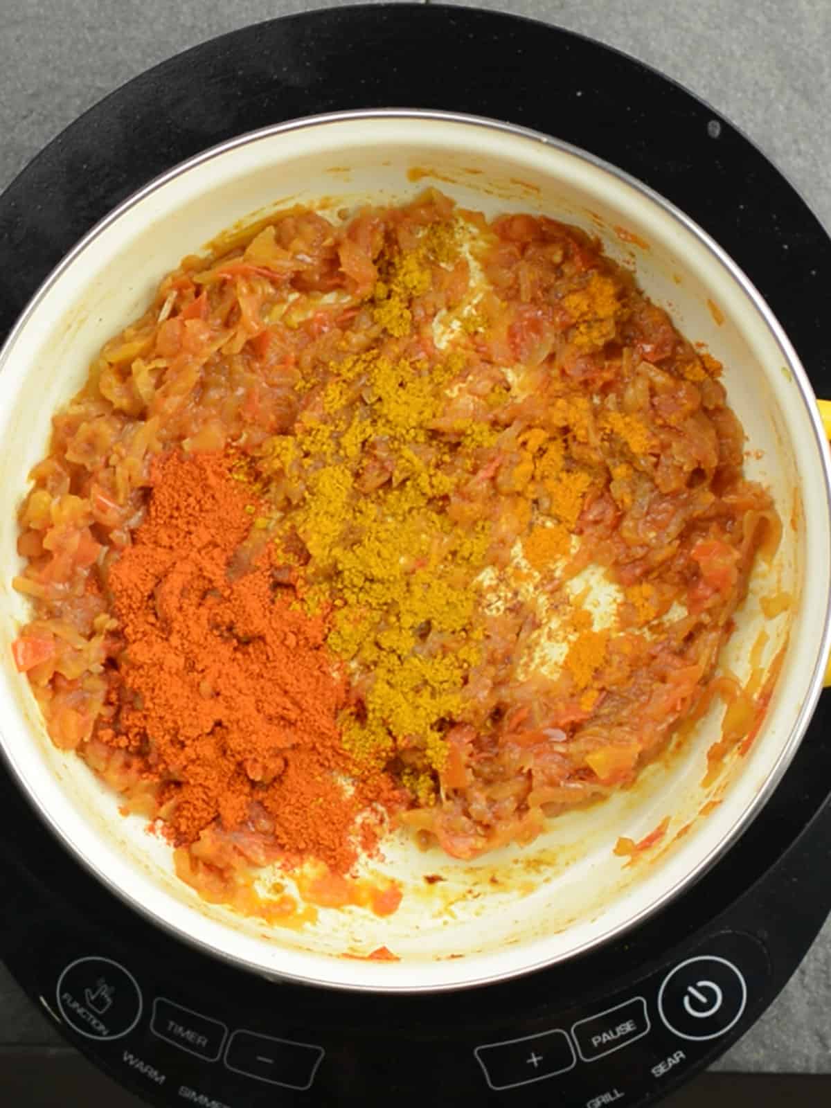 - Add paprika, cayenne pepper, ground turmeric, and garam masala. And stir for a couple of seconds without burning them.