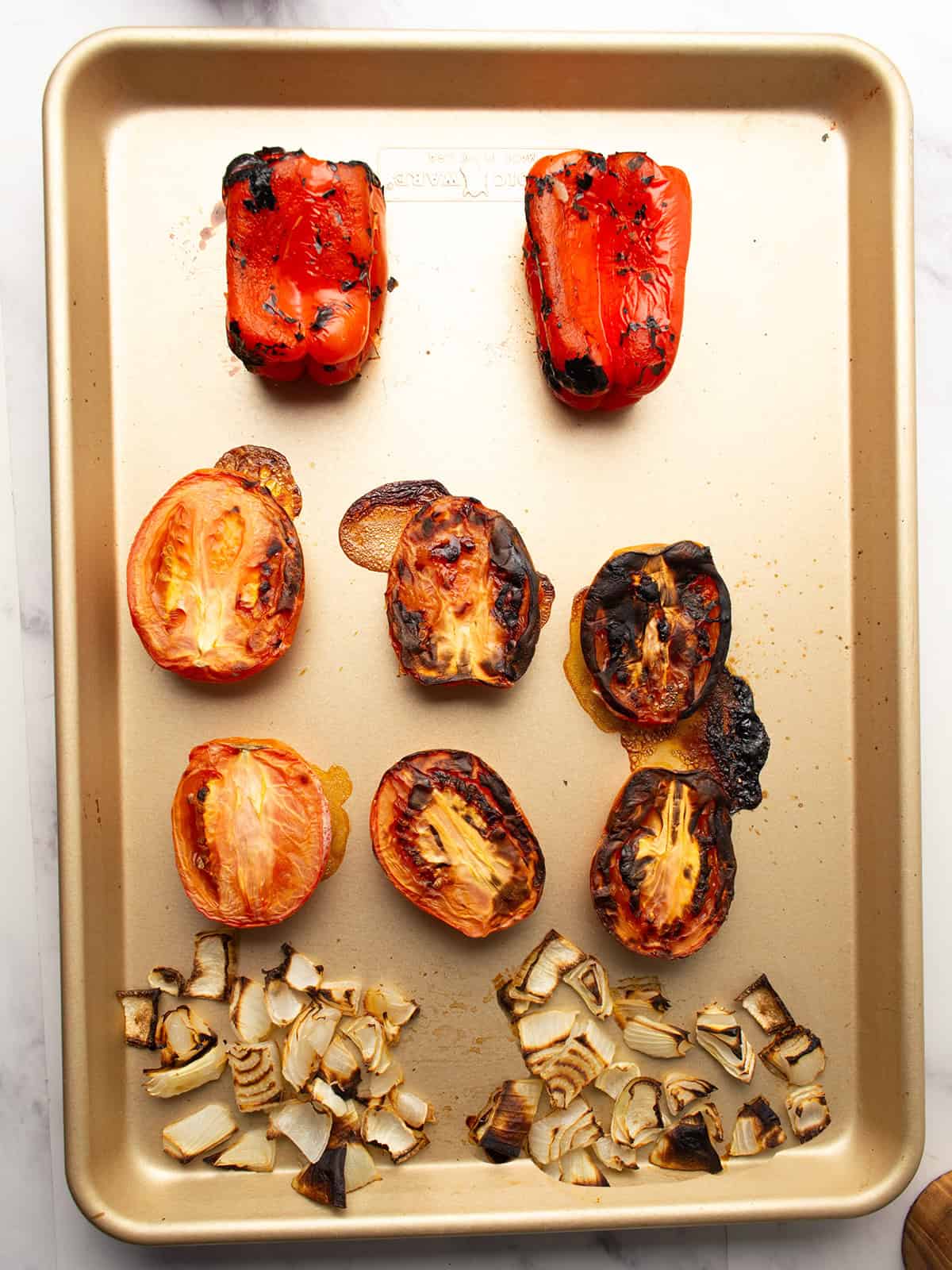- Place whole peppers, halved tomatoes (cut side up), garlic cloves, and onion chunks on a baking sheet.
