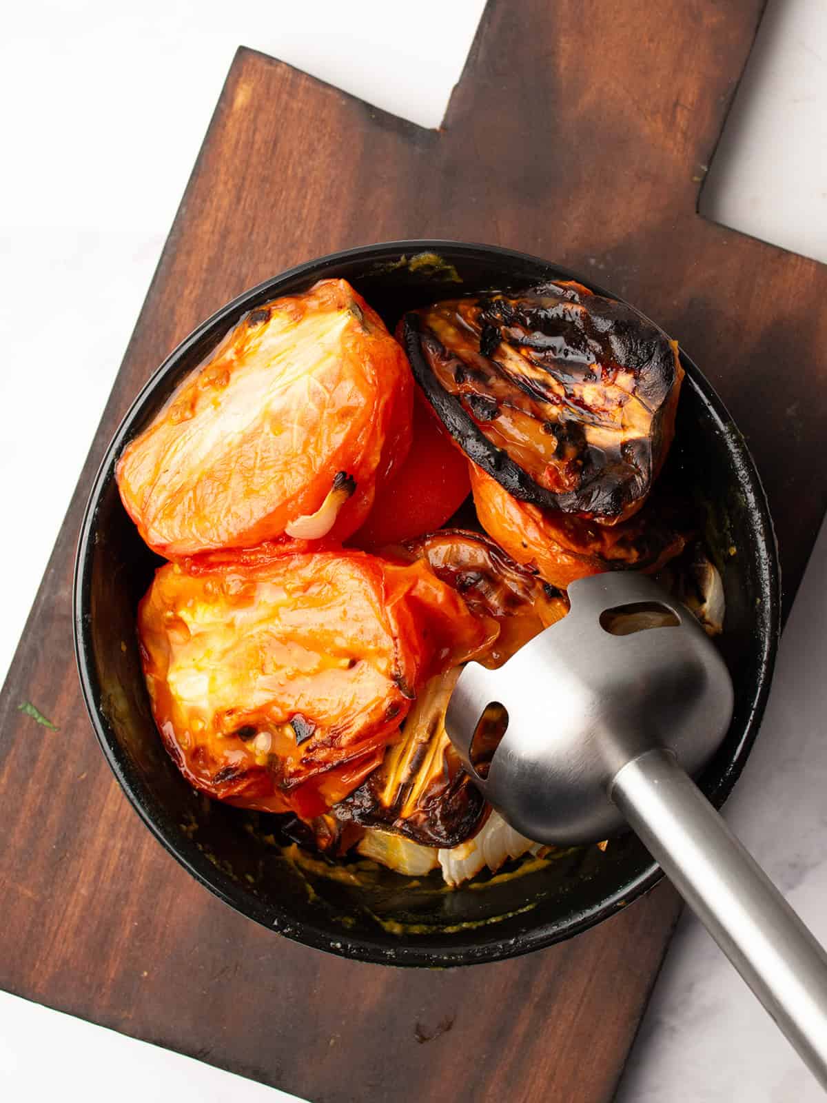 - Roast peppers, tomatoes, onion, and garlic at 400°F for 25 minutes until charred and soft.